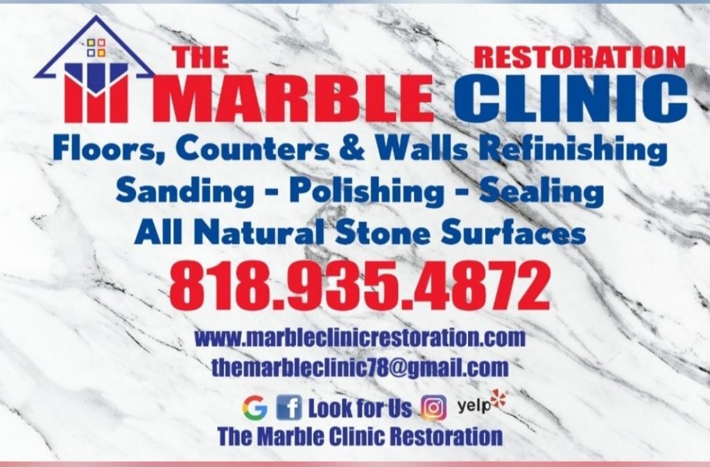 Based in Los Angeles, CA, the Marble Clinic Restoration is a full-service restoration and maintenance company servicing different kinds of stones such as Travertine, Limestone, Terrazzo, Slate, Ceramic, Pavers, Brick, Concrete, Marble, Granite, and more. We specialize in honing, polishing, refinishing, resurfacing, and repairing natural stones such as marble. Marbles or stones that have become dull, scratched, etched, cracked, chipped, or contain dirt, grime, grout, hard water stains, or are old stones do not have to be replaced. We promise to restore your marble or stone to its original state –even better sometimes.